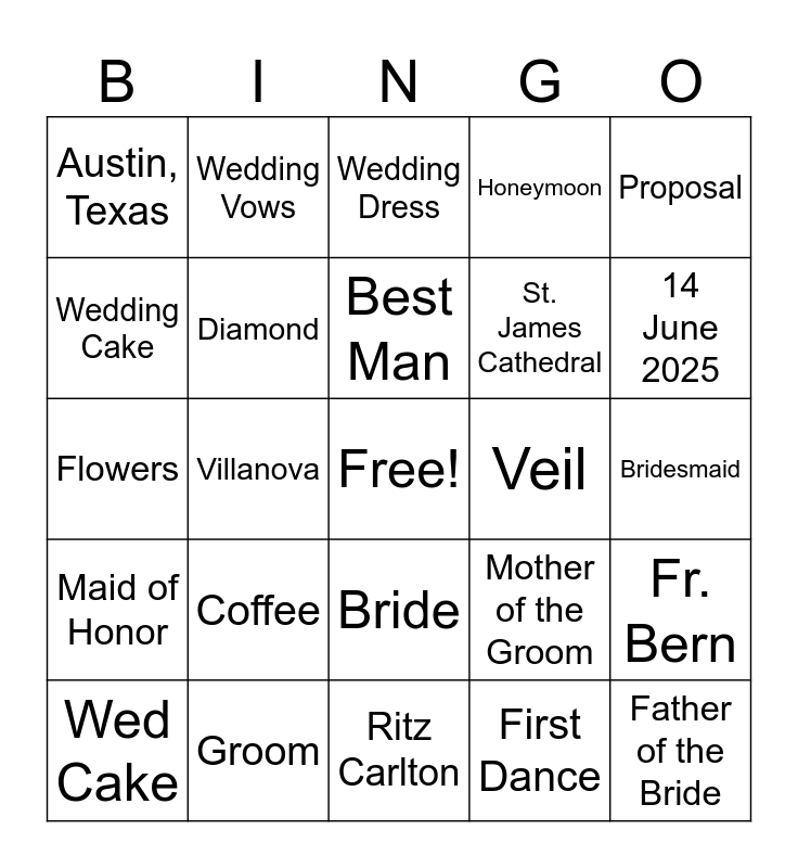 This bingo card has a free space and 29 words: Wed Cake, Chicago, Villanova, Mother of the Bride, Austin, Texas, Wedding Dress, Diamond, Coffee, Veil, Groom, Bridesmaid, Father of the Bride, Ritz Carlton, First Dance, 14 June 2025, Dance, Bride, Maid of Honor, Proposal, Flowers, Mother of the Groom, Chicago, St. James Cathedral, Wedding Cake, Honeymoon, Wedding Vows, Fr. Bern, Best Man and Groomsmen.