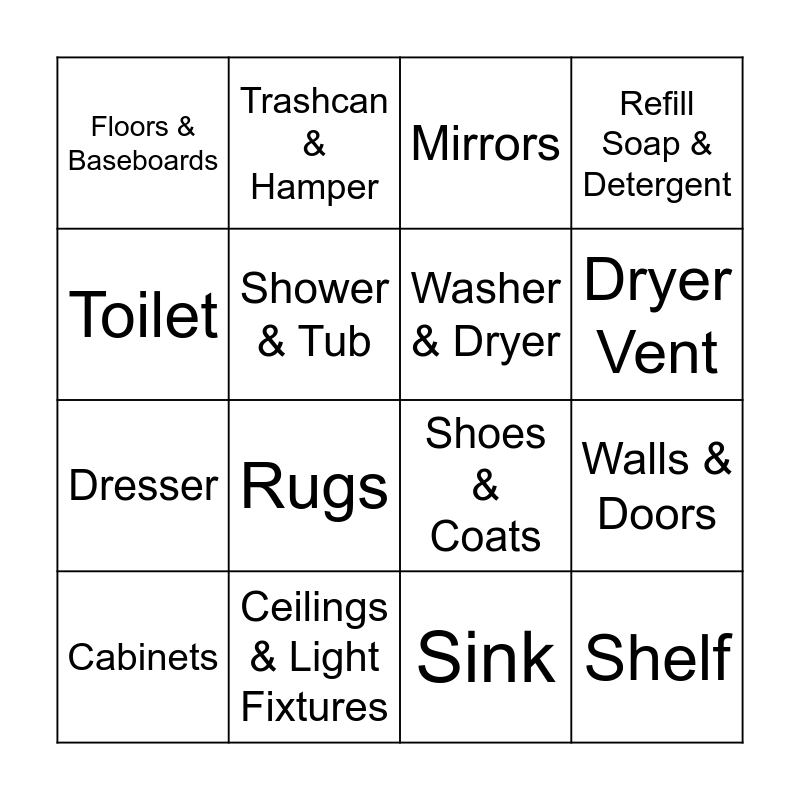 This bingo card has 16 words: Ceilings & Light Fixtures, Walls & Doors, Mirrors, Floors & Baseboards, Dresser, Trashcan & Hamper, Shoes & Coats, Sink, Toilet, Shower & Tub, Cabinets, Refill Soap & Detergent, Rugs, Dryer Vent, Washer & Dryer and Shelf.