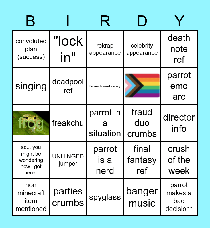 This bingo card has 2 images, a free space and 23 words: UNHINGED jumper, parfies crumbs, ferre/clown/branzy, non minecraft item mentioned, death note ref, convoluted plan (success), singing, "lock in", fraud duo crumbs, parrot is a nerd, frog, final fantasy ref, crush of the week, deadpool ref, banger music, director info, rekrap appearance, parrot emo arc, freakchu, parrot makes a bad decision*, so... you might be wondering how i got here.., celebrity appearance and spyglass.