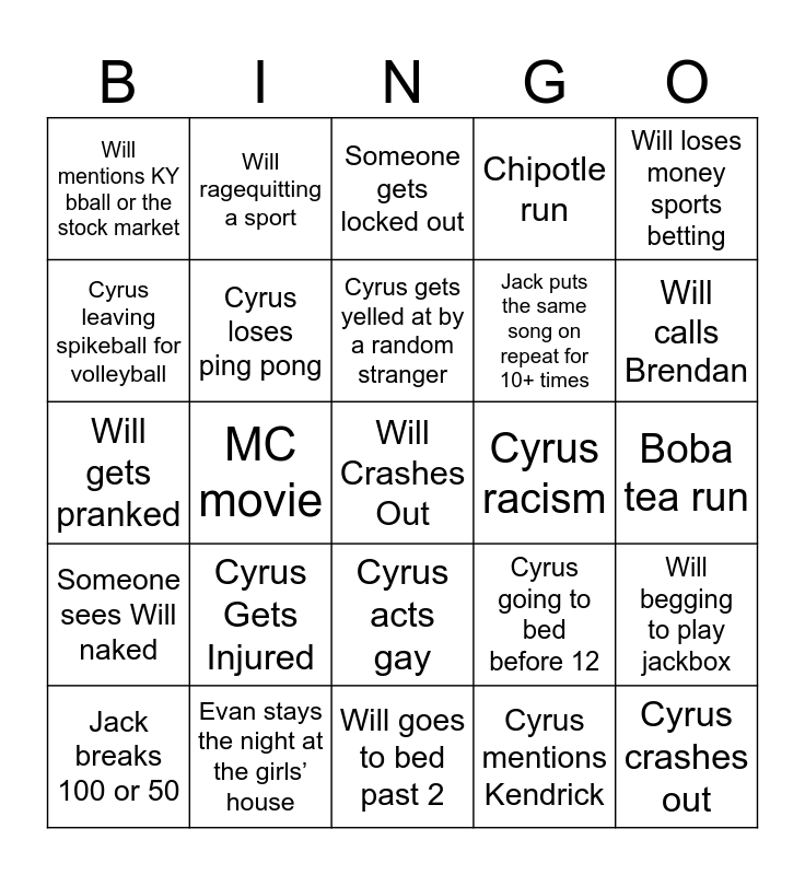 This bingo card has a free space and 24 words: Cyrus Gets Injured, Evan stays the night at the girls’ house, Cyrus gets yelled at by a random stranger, Jack breaks 100 or 50, Will loses money sports betting, Will mentions KY bball or the stock market, Cyrus leaving spikeball for volleyball, Will ragequitting a sport, Cyrus racism, Cyrus acts gay, Jack puts the same song on repeat for 10+ times, Will gets pranked, Cyrus going to bed before 12, Will begging to play jackbox, Cyrus loses ping pong, Cyrus mentions Kendrick, Boba tea run, Someone gets locked out, Will calls Brendan, MC movie, Cyrus crashes out, Someone sees Will naked, Chipotle run and Will goes to bed past 2.