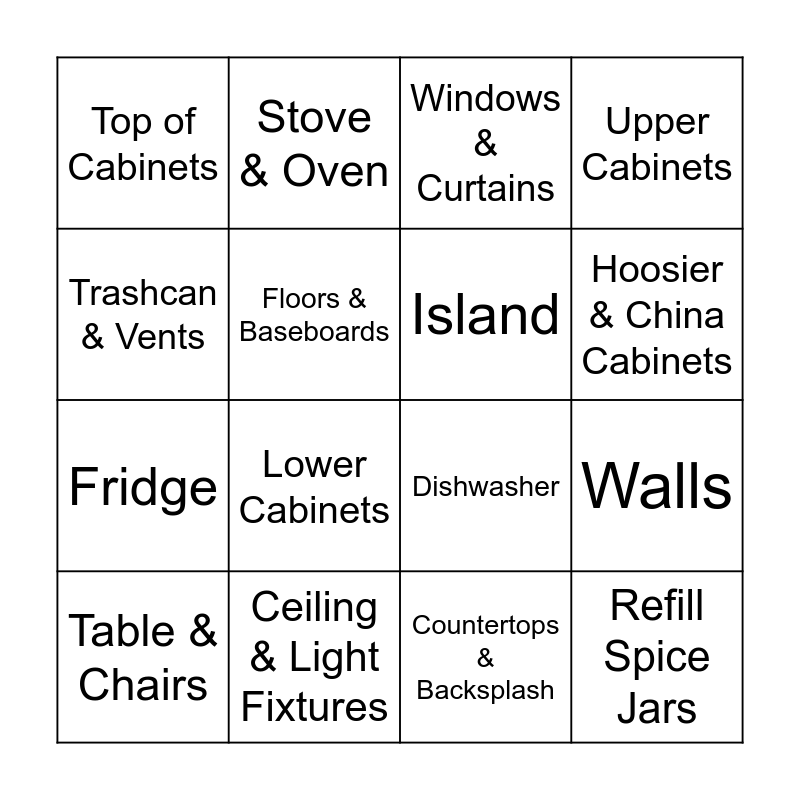 This bingo card has 16 words: Ceiling & Light Fixtures, Walls, Windows & Curtains, Top of Cabinets, Fridge, Stove & Oven, Dishwasher, Countertops & Backsplash, Trashcan & Vents, Floors & Baseboards, Table & Chairs, Upper Cabinets, Lower Cabinets, Hoosier & China Cabinets, Island and Refill Spice Jars.