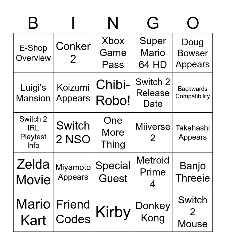 This bingo card has a free space and 29 words: Mario Kart, Zelda, Switch 2 NSO, Nintendo Museum Switch 2, E-Shop Overview, Xbox Game Pass, Koizumi Appears, Miyamoto Appears, Miiverse 2, Friend Codes, Takahashi Appears, Switch 2 Mouse, Kirby, Donkey Kong, Backwards Compatibility, Doom the Dark Ages, Special Guest, Zelda Movie, Doug Bowser Appears, Switch 2 IRL Playtest Info, Metroid Prime 4, Controller Functionality Overview, Switch 2 Release Date, Luigi's Mansion, Super Mario 64 HD, Conker 2, Banjo Threeie, Chibi-Robo! and Billy Hatcher 2.