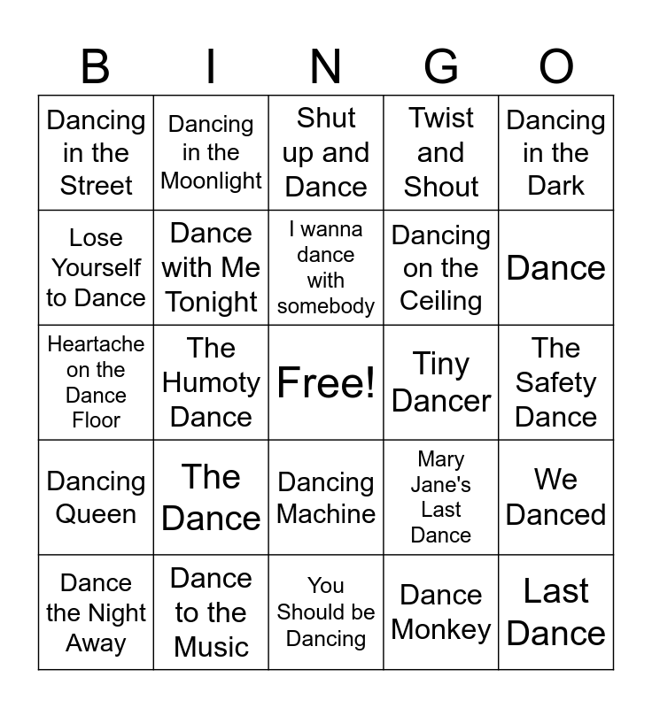 This bingo card has a free space and 34 words: Dance the Night, Dance Monkey, Just Dance, Dance, Dance, Dancing Queen, Dance with Me Tonight, Dancing in the Dark, Dance the Night Away, Dancing in the Moonlight, Dancing on my Own, I wanna dance with somebody, Shut up and Dance, Magic Dance, Stolen Dance, Tiny Dancer, Dance, Dance to the Music, Heartache on the Dance Floor, The Dance, Mary Jane's Last Dance, Dancing Machine, Slow Dancing in a Burning Room, Dancing in the Street, The Safety Dance, You Should be Dancing, Last Dance, Twist and Shout, All She Wants To Do Is Dance, Dancing on the Ceiling, Lose Yourself to Dance, I Just Want to Dance with You, The Humoty Dance, We Danced and Save the Last Dance for Me.