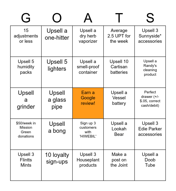 This bingo card has a free space and 24 words: Upsell a bong, 10 loyalty sign-ups, Upsell a smell-proof container, Upsell 3 Flintts Mints, Upsell 3 Sunnyside* accessories, 15 adjustments or less, Upsell 5 humidity packs, Upsell a one-hitter, Upsell a Vessel battery, Sign up 3 customers with 'HIWEBIL', Upsell 10 Cartisan batteries, Upsell a grinder, Upsell a Lookah Bear, Upsell 3 Edie Parker accessories, Upsell 5 lighters, Make a post on the Joint, Perfect drawer (+/- $.05, correct cash/debit), Upsell a dry herb vaporizer, Upsell a Randy's cleaning product, Upsell a glass pipe, Upsell a Doob Tube, $50/week in Mission Green donations, Average 2.5 UPT for the week and Upsell 3 Houseplant products.