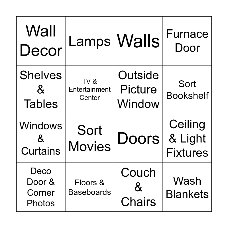 This bingo card has 16 words: Floors & Baseboards, Ceiling & Light Fixtures, Walls, Wall Decor, Windows & Curtains, Lamps, Doors, Couch & Chairs, Shelves & Tables, TV & Entertainment Center, Deco Door & Corner Photos, Furnace Door, Sort Movies, Sort Bookshelf, Outside Picture Window and Wash Blankets.