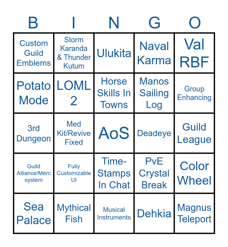 This bingo card has a free space and 24 words: Fully Customizable UI, Mythical Fish, Horse Skills In Towns, Sea Palace, Val RBF, Custom Guild Emblems, Potato Mode, Storm Karanda & Thunder Kutum, Deadeye, Time-Stamps In Chat, Manos Sailing Log, 3rd Dungeon, PvE Crystal Break, Color Wheel, LOML 2, Dehkia, Guild League, Ulukita, Group Enhancing, Med Kit/Revive Fixed, Magnus Teleport, Guild Alliance/Merc system, Naval Karma and Musical Instruments.