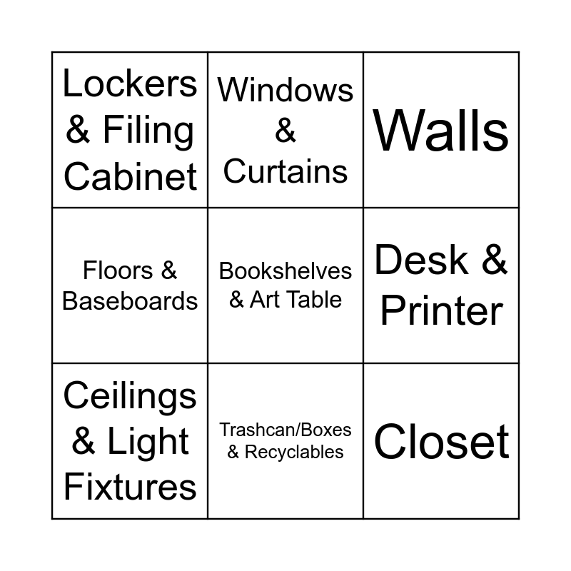 This bingo card has 9 words: Ceilings & Light Fixtures, Walls, Windows & Curtains, Floors & Baseboards, Lockers & Filing Cabinet, Desk & Printer, Bookshelves & Art Table, Closet and Trashcan/Boxes & Recyclables.
