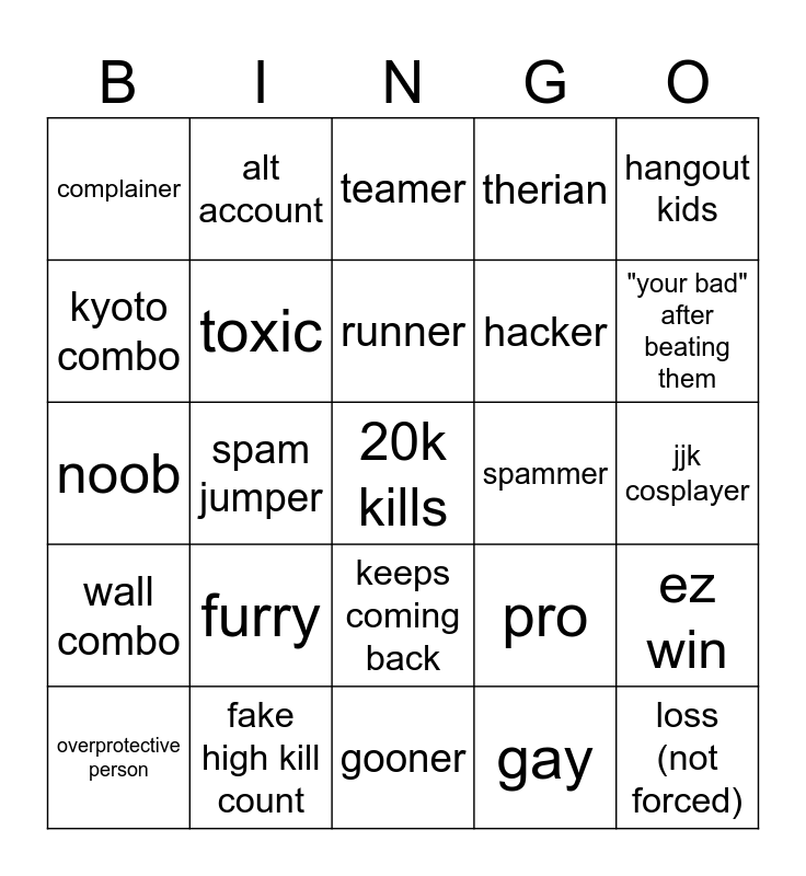 This bingo card has 25 words: furry, gooner, runner, overprotective person, hangout kids, complainer, kyoto combo, alt account, spammer, keeps coming back, hacker, noob, pro, ez win, toxic, loss (not forced), jjk cosplayer, teamer, "your bad" after beating them, spam jumper, 20k kills, fake high kill count, wall combo, therian and gay.