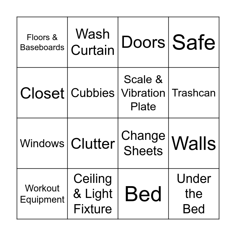 This bingo card has 16 words: Ceiling & Light Fixture, Walls, Doors, Floors & Baseboards, Windows, Wash Curtain, Change Sheets, Bed, Closet, Cubbies, Workout Equipment, Safe, Clutter, Trashcan, Scale & Vibration Plate and Under the Bed.