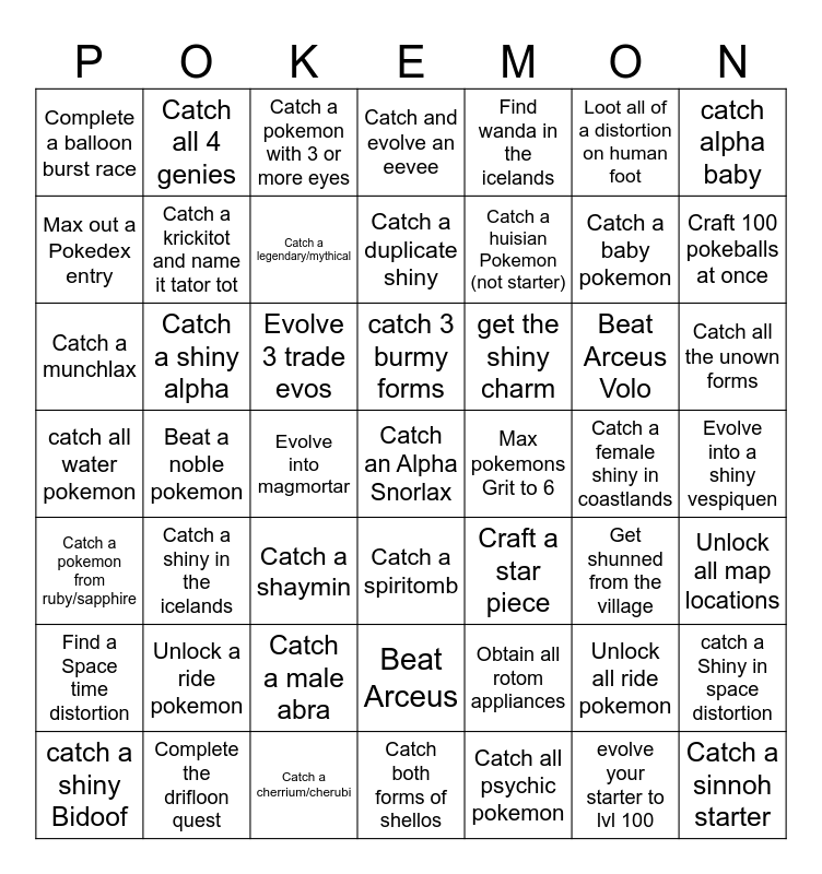 This bingo card has 49 words: Unlock all ride pokemon, Catch a baby pokemon, Catch all psychic pokemon, Beat a noble pokemon, Evolve 3 trade evos, Evolve into a shiny vespiquen, Catch all 4 genies, Catch a cherrium/cherubi, Loot all of a distortion on human foot, Catch a spiritomb, catch alpha baby, Catch and evolve an eevee, Beat Arceus Volo, get the shiny charm, Unlock a ride pokemon, Catch a female shiny in coastlands, Max out a Pokedex entry, Craft 100 pokeballs at once, catch a Shiny in space distortion, Find wanda in the icelands, Catch a huisian Pokemon (not starter), Evolve into magmortar, Complete a balloon burst race, Catch a krickitot and name it tator tot, catch a shiny Bidoof, Catch a legendary/mythical, Catch all the unown forms, Complete the drifloon quest, catch 3 burmy forms, Catch a shiny alpha, Catch a sinnoh starter, Max pokemons Grit to 6, Find a Space time distortion, Catch a male abra, catch all water pokemon, Craft a star piece, Get shunned from the village, Unlock all map locations, Catch a munchlax, Catch a shaymin, Beat Arceus, Catch a pokemon from ruby/sapphire, Catch an Alpha Snorlax, Catch both forms of shellos, Catch a duplicate shiny, Catch a pokemon with 3 or more eyes, Obtain all rotom appliances, Catch a shiny in the icelands and evolve your starter to lvl 100.