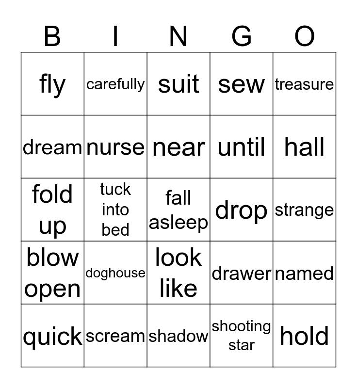 This bingo card has 38 words: except, grow up, begin to, nurse, named, doghouse, near, wake up, treasure, until, tuck into bed, sew, fall asleep, strange, dream, blow open, dressed in, suit, leaf, drop, fly, scream, hall, quick, catch, shadow, hold, get away, run down to, look up, a flash of, look like, shooting star, carefully, dresser, drawer, fold up and go to sleep.