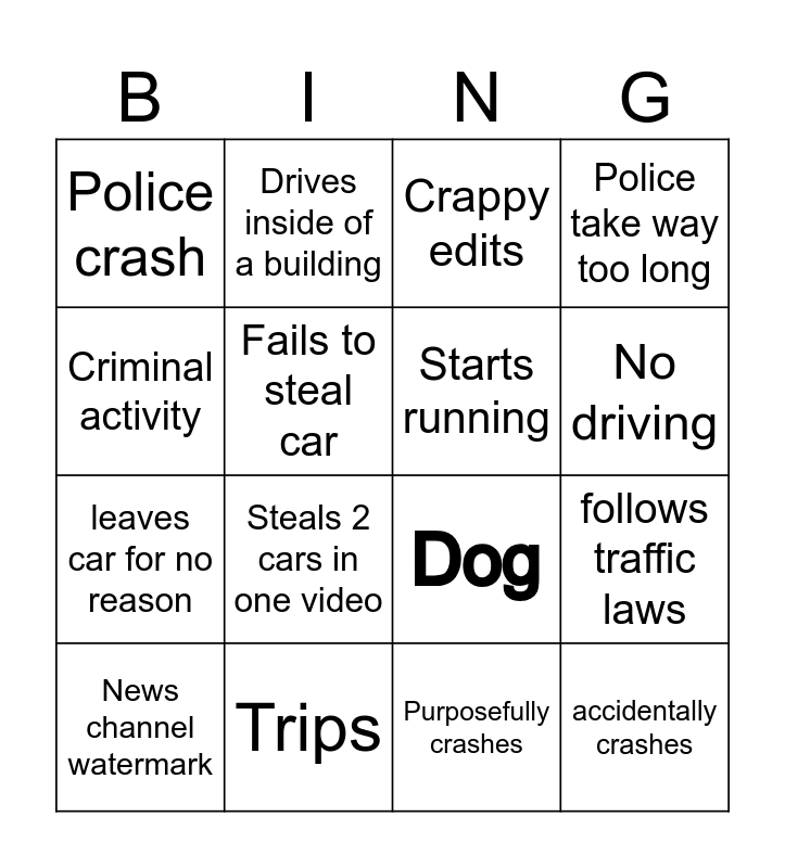 This bingo card has 16 words: Trips, follows traffic laws, Crappy edits, Police crash, leaves car for no reason, Drives inside of a building, Dog, Purposefully crashes, Criminal activity, Fails to steal car, News channel watermark, Police take way too long, Steals 2 cars in one video, No driving, Starts running and accidentally crashes.
