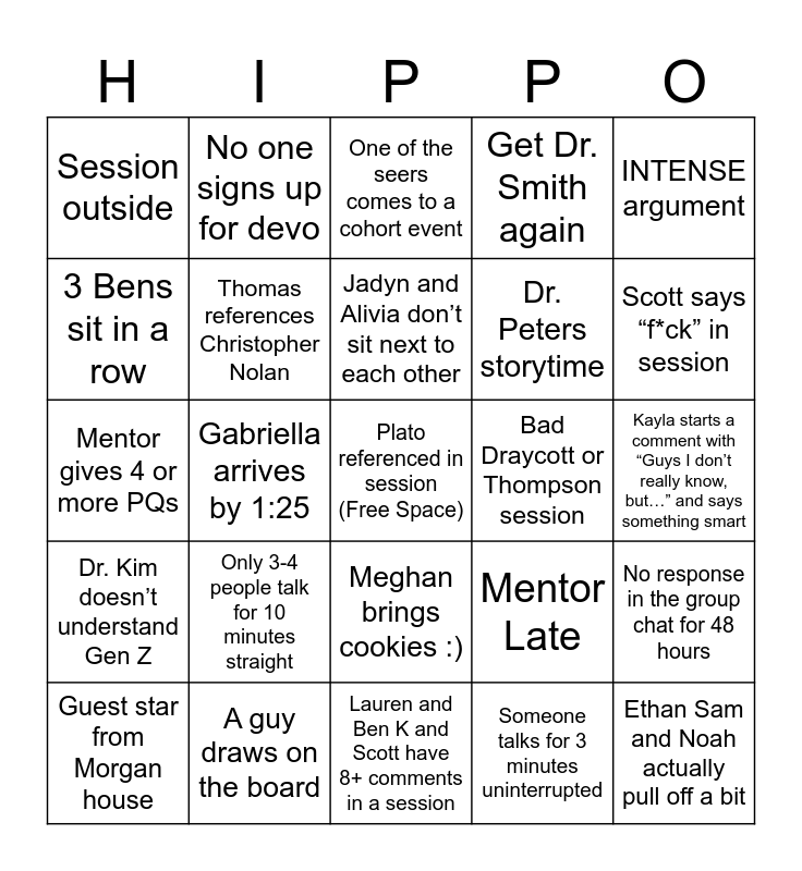 This bingo card has a free space and 24 words: Only 3-4 people talk for 10 minutes straight, A guy draws on the board, Jadyn and Alivia don’t sit next to each other, Guest star from Morgan house, INTENSE argument, Session outside, 3 Bens sit in a row, No one signs up for devo, Bad Draycott or Thompson session, Meghan brings cookies :), Dr. Peters storytime, Mentor gives 4 or more PQs, Mentor Late, No response in the group chat for 48 hours, Thomas references Christopher Nolan, Someone talks for 3 minutes uninterrupted, Kayla starts a comment with “Guys I don’t really know, but…” and says something smart, One of the seers comes to a cohort event, Scott says “f*ck” in session, Gabriella arrives by 1:25, Ethan Sam and Noah actually pull off a bit, Dr. Kim doesn’t understand Gen Z, Get Dr. Smith again and Lauren and Ben K and Scott have 8+ comments in a session.