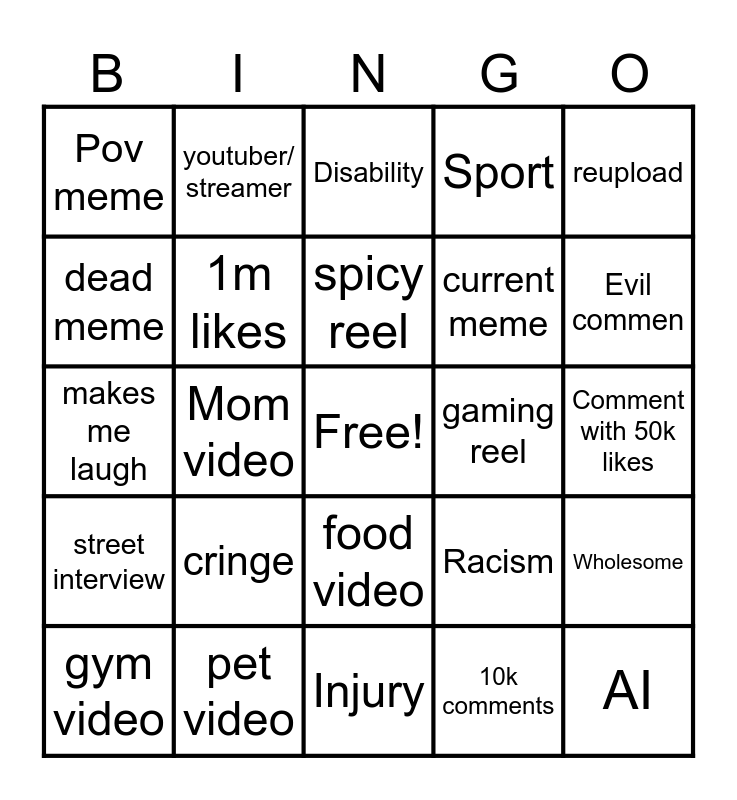 This bingo card has a free space and 24 words: cringe, pet video, spicy reel, gym video, reupload, Pov meme, dead meme, youtuber/ streamer, gaming reel, food video, current meme, makes me laugh, Racism, Wholesome, 1m likes, 10k comments, Comment with 50k likes, Disability, Evil commen, Mom video, AI, street interview, Sport and Injury.