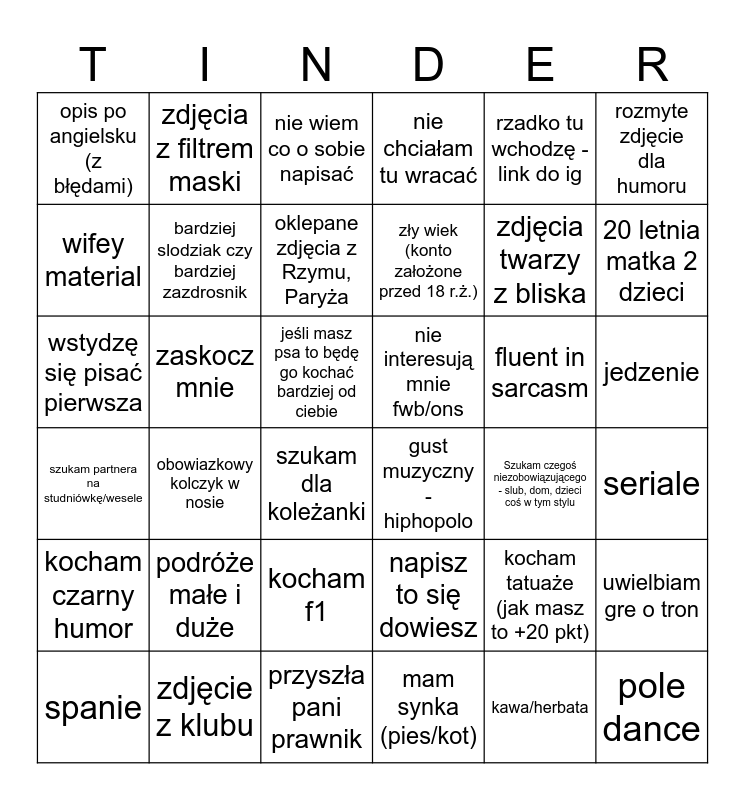 This bingo card has 36 words: napisz to się dowiesz, kocham f1, mam synka (pies/kot), wifey material, szukam partnera na studniówkę/wesele, nie interesują mnie fwb/ons, bardziej slodziak czy bardziej zazdrosnik, przyszła pani prawnik, rzadko tu wchodzę - link do ig, kocham tatuaże (jak masz to +20 pkt), 20 letnia matka 2 dzieci, nie chciałam tu wracać, uwielbiam gre o tron, zaskocz mnie, zły wiek (konto założone przed 18 r.ż.), opis po angielsku (z błędami), kocham czarny humor, fluent in sarcasm, wstydzę się pisać pierwsza, nie wiem co o sobie napisać, jeśli masz psa to będę go kochać bardziej od ciebie, obowiazkowy kolczyk w nosie, gust muzyczny - hiphopolo, szukam dla koleżanki, Szukam czegoś niezobowiązującego - slub, dom, dzieci coś w tym stylu, zdjęcia z filtrem maski, zdjęcia twarzy z bliska, zdjęcie z klubu, oklepane zdjęcia z Rzymu, Paryża, rozmyte zdjęcie dla humoru, pole dance, spanie, seriale, jedzenie, podróże małe i duże and kawa/herbata.