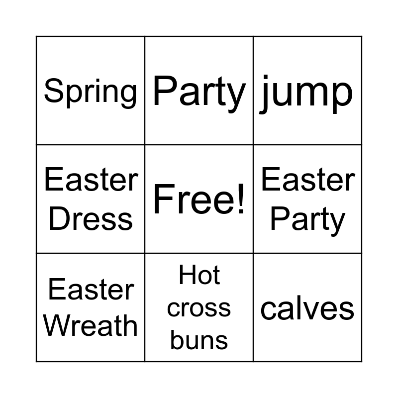 This bingo card has a free space and 35 words: Easter Flowers, Easter Card, Easter Chocolat, Easter Wreath, Easter Rabbit, Easter Dress, Easter Party, Easter Parade, Hot cross buns, chicks, lambs, calves, nest, Easter Dinner, Spring, bow, cross, Easter Bunny, Easter Eggs, Prayer, walk, mass, hat, run, jump, parade, Easter Hunt, Free!!!, Easter Card, Happy Easter, Fun, Easter, flowers, Party and Dress up.
