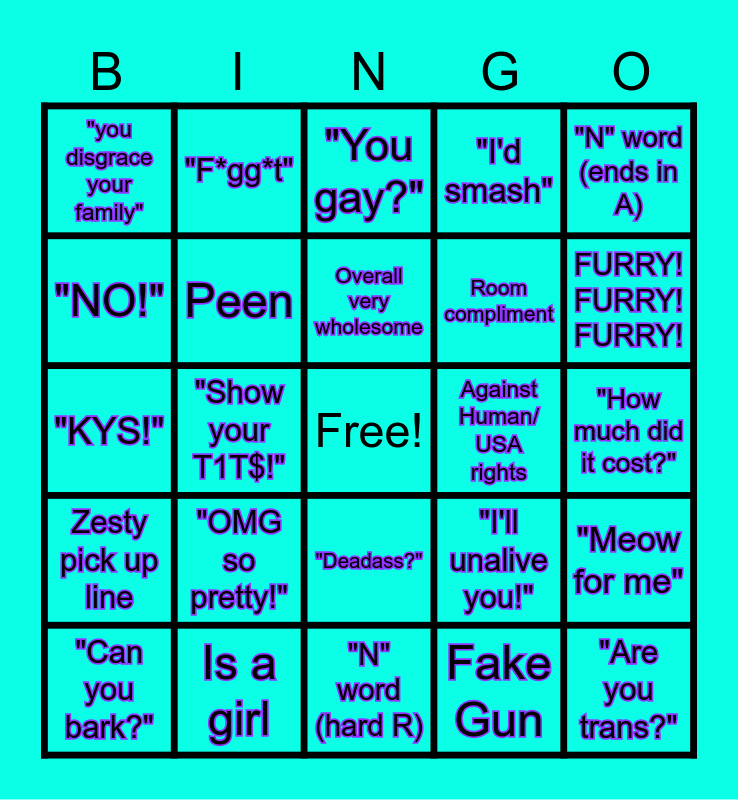 This bingo card has a free space and 24 words: "Can you bark?", "OMG so pretty!", Overall very wholesome, Fake Gun, "N" word (ends in A), "you disgrace your family", "F*gg*t", "You gay?", Against Human/ USA rights, "How much did it cost?", "KYS!", Peen, "I'll unalive you!", "Meow for me", "NO!", Is a girl, "N" word (hard R), "I'd smash", FURRY! FURRY! FURRY!, Zesty pick up line, "Show your T1T$!", "Deadass?", Room compliment and "Are you trans?".