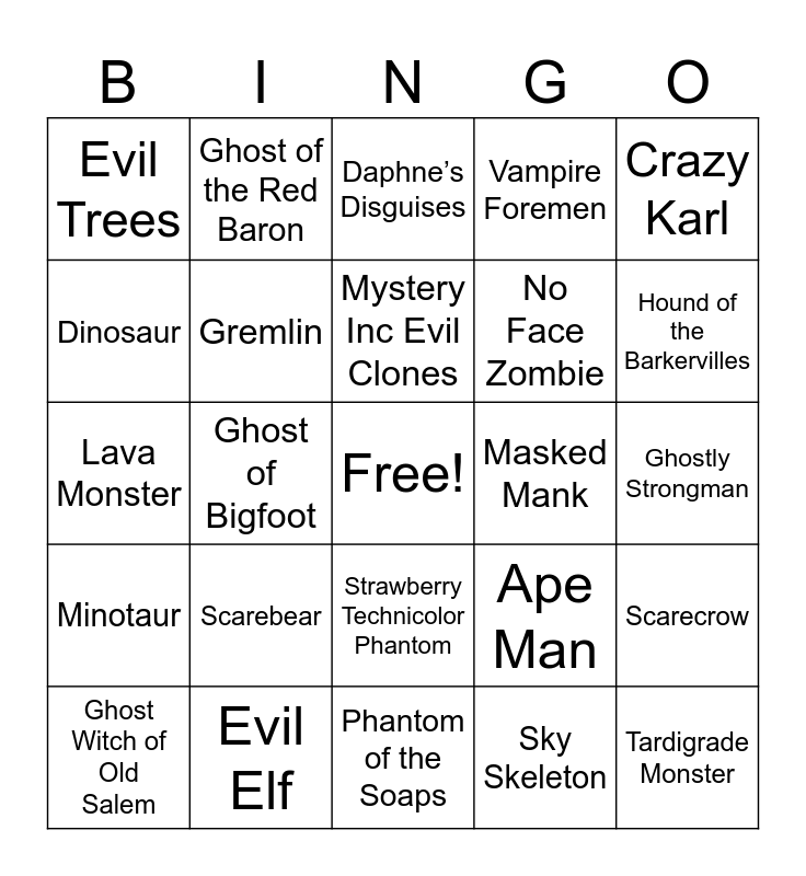 This bingo card has a free space and 141 words: Black Knight, Ghost of Captain Cutler, Phantom, Miner Forty-Niner, Ghost of Elias Kingston, Ape Man, Puppet Master, Ghost Clown, Dracula, Frankenstein, Wolfman, Mummy of Anka, Redbeard’s Ghost, Spooky Space Kook, Phantom Shadows, Snow Ghost, Ghost of Mr. Hyde, Headless Specter, Phony Phantom, Wax Phantom, Vulture, Scarecrow, Hooded Man, Shark Men, Cackling Skeletons, Ghost of Bigfoot, Ghost of the Red Baron, Moat Monster, Haunted Horseman, Viking Mannequin, Ghost of Paul Revere, Fireball McPhan, Green Globs, Ghostly Strongman, 10,000 Volt Ghost, Gator Ghoul, Ghost of Merlin, Ghost of Dr. Coffin, No Face Zombie, Gorilla, Demon Shark, Kelp Monster, Strawberry Technicolor Phantom, Rambling Ghost, Viking Ghosts, Gramps the Vamps, Pterodactyl Ghost, Phantom Racer, Creepy Heap from the Deep, Soulles Captain Clements, Owlmen, Snow Beast, Ghost Witch of Old Salem, Tar Monster, Old Iron Face, Moon Monster, Beast of Bottomless Lake, Nigh Ghoul, Neon Phantom, Snake Demon, Monsters II, Sky Skeleton, Devil Bear, Lady Vampire of the Bay, Star Creature, Minotaur, Shadow Creature, Cat Man, Bing Bong the Monster, Invisible ghosts, Globby, Evil Trees, Lava Monster, Alaskan Monster, Swamp Monster, Flying Monkey, Rock Monster, Sheet Ghost, Vampire Foremen, Carnivorous Plants, Slime Boy, Abominable Snowman, Count Zarko, Seaweed Monster, Hound of the Barkervilles, Creature from Chem Lab, Masked Mank, Randar the Ape Man, Phantom of the Soaps, Spectre of Sports Cars, Red Skull, Maid Mummy, Giant Bees, Evil Elf, Monster Mutt, Monster Mouse, Cheese Monster, Boogedy Bones, Headless Skateboarder, Chickenstein, Dinosaur, Space Ape, Roller Ghoster, Creepy Keeper, Mystery Inc Evil Clones, Toxic Terror, Ghost Truck, Manticore, Graveyyard Ghoul, Scarebear, Dandy Highwayman, Man-Bat, Crazy Karl, Tardigrade Monster, Werecats, Gremlin, Phantom of the Opry, Mummy of Doom, Mad Sea Lion, Ghost of Christmas Never, Reflector Specter, Characters + character items, Velma, Velma’s glasses, Magnifying glass, Scooby, Scooby snacks, Collar, Shaggy, Sandwiches, Fred, Bellbottoms, Ascot, Daphne, Purple head scarf, Scrappy Doo, Daphne’s Disguises, Freddie Prinze Jr, Sarah Michelle Gellar, Matthew Lillard and Lisa Cardanelli.