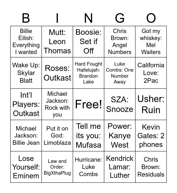 This bingo card has a free space and 40 words: Ms. Jackson: Outkast, Int’l Players: Outkast, So Fresh, So Clean: Outkast, Roses: Outkast, Law and Order: BigXthaPlug, Tell me its you: Mufasa, Hard Fought Hallelujah: Brandon Lake, Last Two Dollars: Johnnie Taylor, Got my whiskey: Mel Waiters, Michael Jackson: Billie Jean, Michael Jackson: Rock with you, Chris Brown: Angel Numbers, Chris Brown: Residuals, Usher: Ruin, SZA: Snooze, Put it on God: Limoblaza, Help Me: Real Boston, Billie Eilish: Everything I wanted, Stay fly: Big Tymers, Boosie: Set if Off, Kevin Gates: 2 phones, Kendrick Lamar: Luther, Luke Combs: One Number Away, Wake Up: Skylar Blatt, Yeah Glo: Glorilla, Ella Mai: Little Things, Great Gatsby: Rod Wave, Lose Control: Teddy Swims, Hotel California: Eagles, Hotel Lobby: Quave and takeoff, Abracadabra: lady gaga, Lose Yourself: Eminem, Work Had Play hard: Wiz Khalifa, Power: Kanye West, California Love: 2Pac, Hurricane: Luke Combs, Tennessee Whiskey, Are you even real: Teddy Swims, Mutt: Leon Thomas and TV off: Kendrick Lamar.