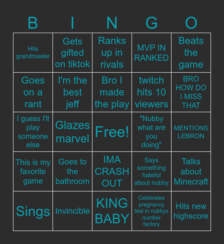 This bingo card has a free space and 34 words: Someone mentions R6, Celebrates pregnancy test in nubbys number factory, Talks about throwing it in a circle, Gets gifted a sub, This is my favorite game, I'm the best jeff, Beats the game, Sings, Gets gifted on tiktok, I hate this game, Bro I made the play, Ranks up in rivals, Bits!, Talks about my son, "Nubby what are you doing", BRO HOW DO I MISS THAT, Invincible, I guess I'll play someone else, Goes to the bathroom, Says something hateful about nubby, IMA CRASH OUT, My team sold, Hits grandmaster, MENTIONS LEBRON, KING BABY, Hits new highscore, MVP IN RANKED, Stream idea, twitch hits 10 viewers, Goes on a rant, Talks about comics, Glazes marvel, Talks about Minecraft and Gets told to switch off hero.