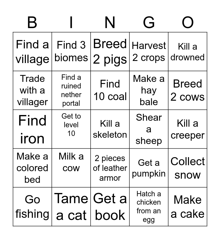 This bingo card has a free space and 24 words: Milk a cow, Tame a cat, Find 10 coal, Go fishing, Kill a drowned, Find a village, Trade with a villager, Find 3 biomes, Shear a sheep, 2 pieces of leather armor, Make a hay bale, Find iron, Get a pumpkin, Collect snow, Find a ruined nether portal, Hatch a chicken from an egg, Kill a creeper, Breed 2 pigs, Breed 2 cows, Get to level 10, Make a cake, Make a colored bed, Harvest 2 crops and Get a book.