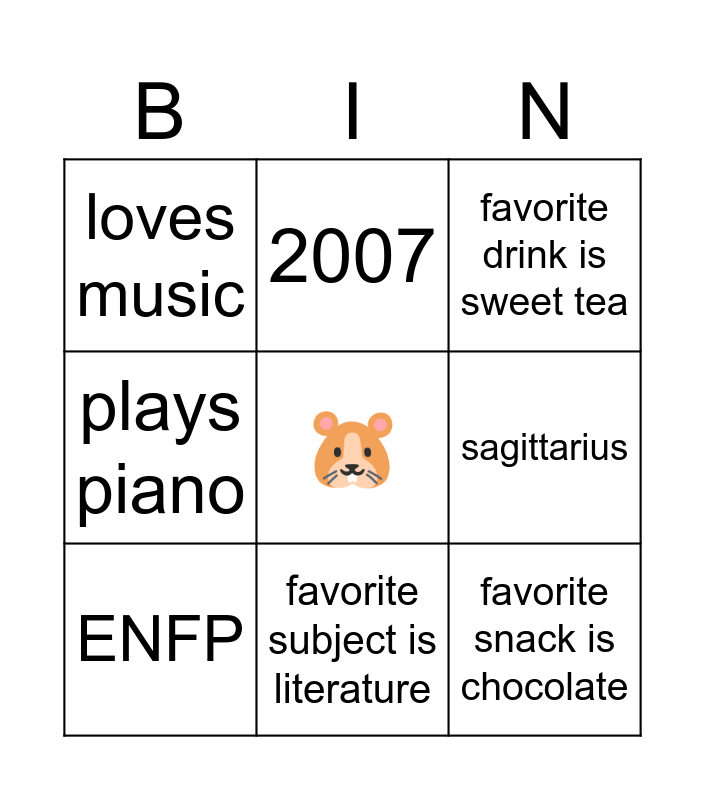 This bingo card has a free space and 8 words: sagittarius, favorite drink is sweet tea, 2007, ENFP, loves music, favorite snack is chocolate, plays piano and favorite subject is literature.
