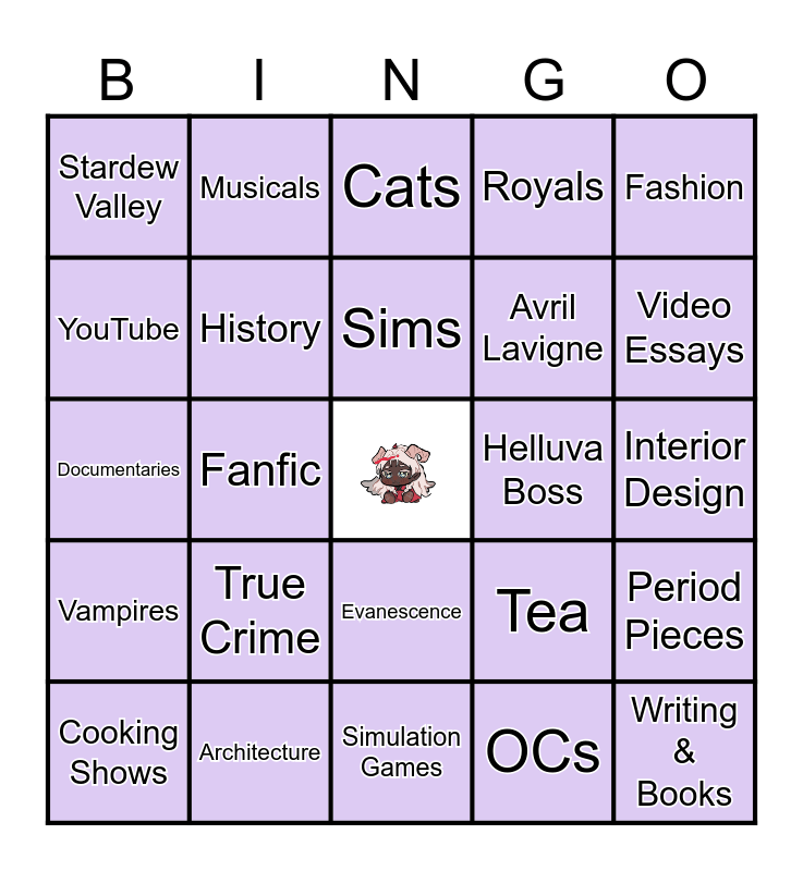 This bingo card has a free space and 24 words: True Crime, Architecture, Sims, Cooking Shows, Fashion, Stardew Valley, YouTube, Musicals, Helluva Boss, Evanescence, Avril Lavigne, Documentaries, Tea, Period Pieces, History, OCs, Interior Design, Cats, Video Essays, Fanfic, Writing & Books, Vampires, Royals and Simulation Games.
