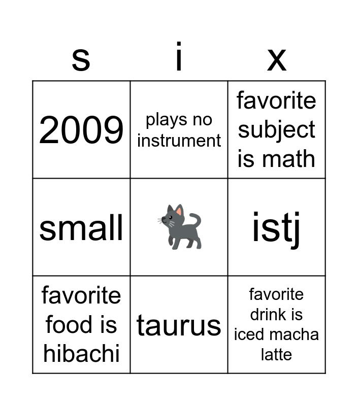 This bingo card has a free space and 8 words: istj, favorite subject is math, plays no instrument, favorite food is hibachi, 2009, favorite drink is iced macha latte, small and taurus.