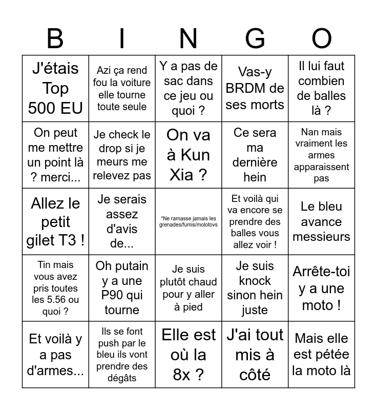 This bingo card has a free space and 24 words: Oh putain y a une P90 qui tourne, Ils se font push par le bleu ils vont prendre des dégâts, On va à Kun Xia ?, Et voilà y a pas d'armes..., Il lui faut combien de balles là ?, J'étais Top 500 EU, On peut me mettre un point là ? merci..., Azi ça rend fou la voiture elle tourne toute seule, Et voilà qui va encore se prendre des balles vous allez voir !, Je suis plutôt chaud pour y aller à pied, Ce sera ma dernière hein, Allez le petit gilet T3 !, Je suis knock sinon hein juste, Arrête-toi y a une moto !, Je check le drop si je meurs me relevez pas, J'ai tout mis à côté, Le bleu avance messieurs, Y a pas de sac dans ce jeu ou quoi ?, Nan mais vraiment les armes apparaissent pas, Je serais assez d'avis de..., Mais elle est pétée la moto là, Tin mais vous avez pris toutes les 5.56 ou quoi ?, Vas-y BRDM de ses morts and Elle est où la 8x ?.