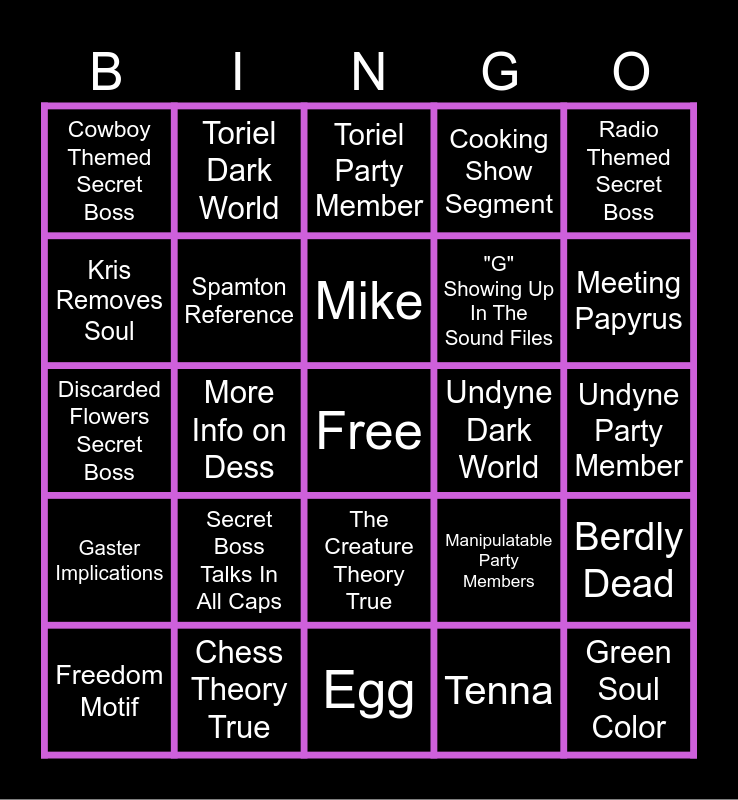 This bingo card has a free space and 24 words: Freedom Motif, Secret Boss Talks In All Caps, Mike, Tenna, Radio Themed Secret Boss, Cowboy Themed Secret Boss, Toriel Dark World, Toriel Party Member, Undyne Dark World, Undyne Party Member, Discarded Flowers Secret Boss, Spamton Reference, Manipulatable Party Members, Berdly Dead, Kris Removes Soul, Chess Theory True, Egg, Cooking Show Segment, Meeting Papyrus, Gaster Implications, More Info on Dess, The Creature Theory True, "G" Showing Up In The Sound Files and Green Soul Color.