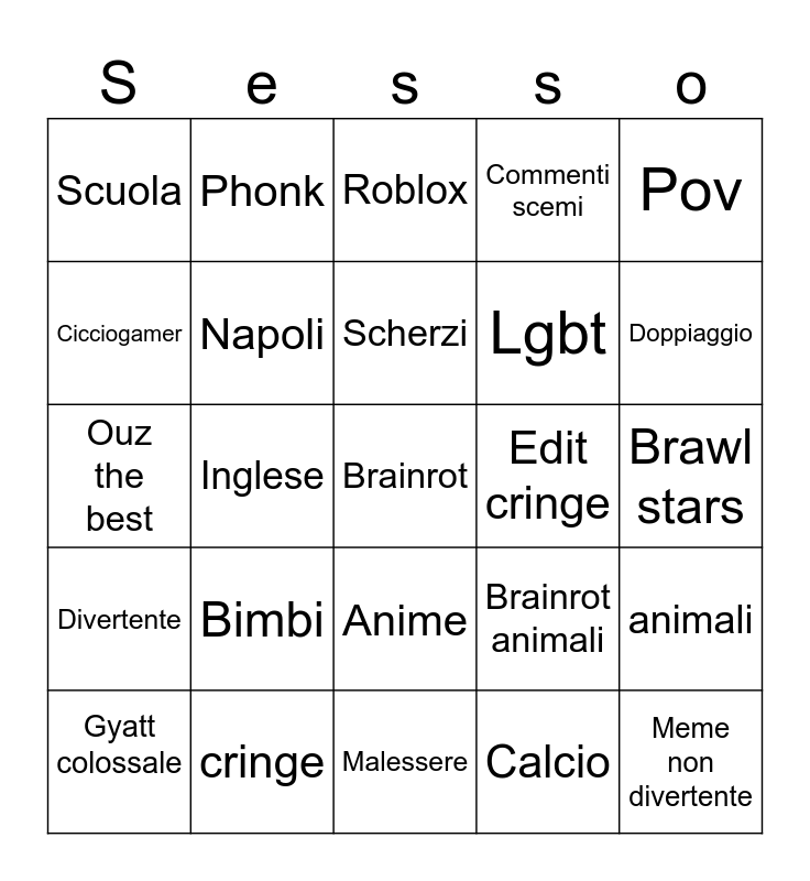 This bingo card has a free space and 24 words: Bimbi, cringe, Scherzi, Gyatt colossale, Pov, Scuola, Cicciogamer, Phonk, Edit cringe, Anime, Lgbt, Ouz the best, Brainrot animali, animali, Napoli, Calcio, Brawl stars, Roblox, Doppiaggio, Inglese, Meme non divertente, Divertente, Commenti scemi and Malessere.