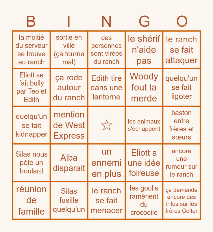 This bingo card has a free space and 24 words: Alba disparait, Silas fusille quelqu'un, Edith tire dans une lanterne, réunion de famille, le ranch se fait attaquer, la moitié du serveur se trouve au ranch, Eliott se fait bully par Teo et Edith, sortie en ville (ça tourne mal), les animaux s'échappent, un ennemi en plus, Woody fout la merde, quelqu'un se fait kidnapper, Eliott a une idée foireuse, encore une rumeur sur le ranch, ça rode autour du ranch, les goulis ramènent du crocodile, baston entre frères et sœurs, des personnes sont virées du ranch, quelqu'un se fait ligoter, mention de West Express, ça demande encore des infos sur les frères Colter, Silas nous pète un boulard, le shérif n'aide pas and le ranch se fait menacer.