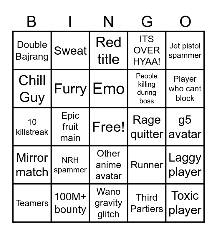 This bingo card has a free space and 24 words: NRH spammer, 100M+ bounty, Emo, Teamers, Jet pistol spammer, Double Bajrang, Chill Guy, Sweat, Rage quitter, Other anime avatar, People killing during boss, 10 killstreak, Runner, Laggy player, Furry, Third Partiers, g5 avatar, Red title, Player who cant block, Epic fruit main, Toxic player, Mirror match, ITS OVER HYAA! and Wano gravity glitch.