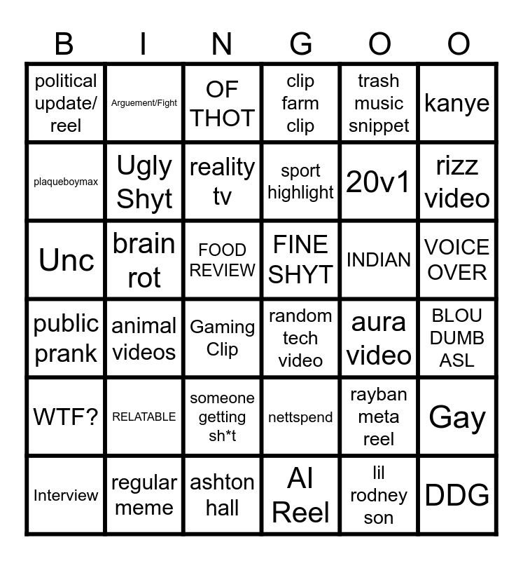 This bingo card has 36 words: nettspend, someone getting sh*t, AI Reel, plaqueboymax, public prank, FINE SHYT, Ugly Shyt, ashton hall, trash music snippet, rayban meta reel, rizz video, clip farm clip, Gay, brain rot, sport highlight, political update/ reel, WTF?, INDIAN, Unc, OF THOT, FOOD REVIEW, animal videos, random tech video, Gaming Clip, aura video, Arguement/Fight, 20v1, regular meme, reality tv, kanye, DDG, Interview, BLOU DUMB ASL, VOICE OVER, RELATABLE and lil rodney son.
