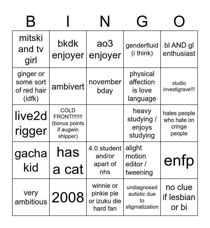 This bingo card has a free space and 24 words: has a cat, 2008, november bday, very ambitious, bl AND gl enthusiast, mitski and tv girl, ginger or some sort of red hair (idfk), bkdk enjoyer, heavy studying / enjoys studying, 4.0 student and/or apart of nhs, physical affection is love language, live2d rigger, alight motion editor / tweening, enfp, ambivert, undiagnosed autistic due to stigmatization, hates people who hate on cringe people, ao3 enjoyer, studio investigrave!!!, COLD FRONT!!!!!!! (bonus points if augwin shipper), no clue if lesbian or bi, gacha kid, genderfluid (i think) and winnie or pinkie pie or izuku die hard fan.