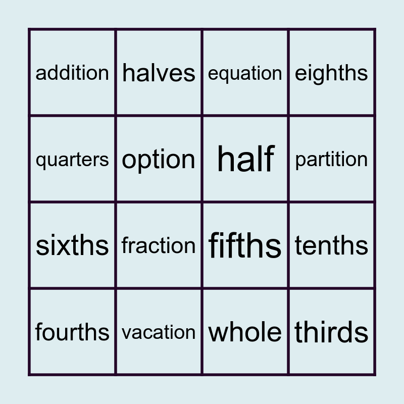 This bingo card has 16 words: vacation, tenths, equation, addition, sixths, halves, fifths, whole, quarters, option, fourths, eighths, fraction, partition, half and thirds.