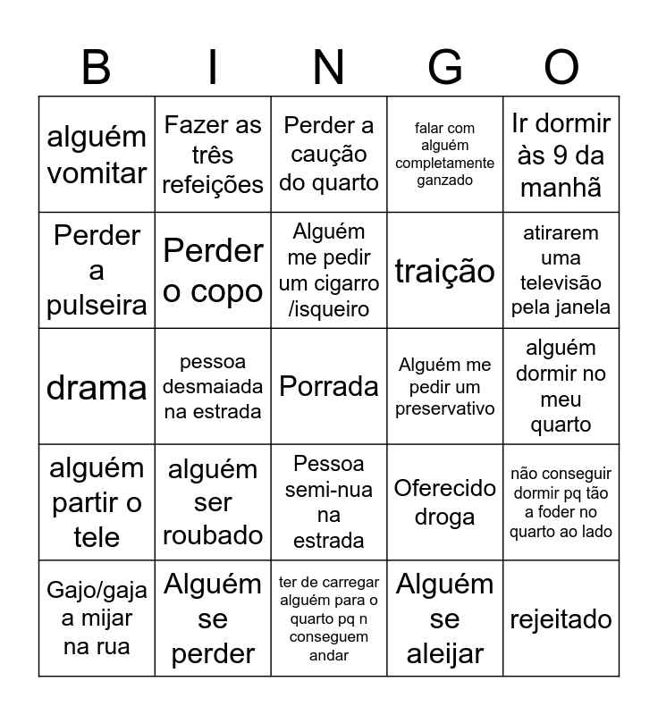This bingo card has a free space and 24 words: alguém ser roubado, Alguém se perder, Alguém me pedir um cigarro /isqueiro, Gajo/gaja a mijar na rua, Ir dormir às 9 da manhã, alguém vomitar, Perder a pulseira, Fazer as três refeições, Alguém me pedir um preservativo, Pessoa semi-nua na estrada, traição, drama, Oferecido droga, não conseguir dormir pq tão a foder no quarto ao lado, Perder o copo, Alguém se aleijar, alguém dormir no meu quarto, Perder a caução do quarto, atirarem uma televisão pela janela, pessoa desmaiada na estrada, rejeitado, alguém partir o tele, falar com alguém completamente ganzado and ter de carregar alguém para o quarto pq n conseguem andar.