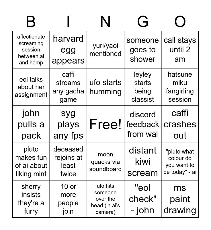 This bingo card has a free space and 24 words: deceased rejoins at least twice, 10 or more people join, ufo starts humming, sherry insists they're a furry, call stays until 2 am, affectionate screaming session between ai and hamp, eol talks about her assignment, harvard egg appears, discord feedback from wal, moon quacks via soundboard, leyley starts being classist, john pulls a pack, distant kiwi scream, "pluto what colour do you want to be today" - ai, caffi streams any gacha game, "eol check" - john, caffi crashes out, yuri/yaoi mentioned, hatsune miku fangirling session, syg plays any fps, ms paint drawing, pluto makes fun of ai about liking mint, someone goes to shower and ufo hits someone over the head (in ai's camera).