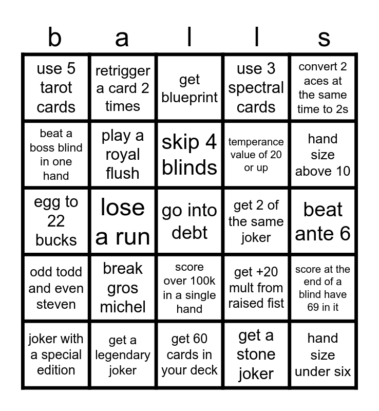 This bingo card has 30 words: get a legendary joker, win a run, lose a run, get over 45 bucks, use 5 tarot cards, get blueprint, play a royal flush, score over 100k in a single hand, get 2 of the same joker, get 60 cards in your deck, beat ante 6, go into debt, get a stone joker, hand size under six, hand size above 10, buy 3 vouchers, get +20 mult from raised fist, odd todd and even steven, break gros michel, convert 2 aces at the same time to 2s, egg to 22 bucks, get a spectral card from sixth sense, retrigger a card 2 times, temperance value of 20 or up, beat a boss blind in one hand, use 3 spectral cards, score at the end of a blind have 69 in it, joker with a special edition, skip 4 blinds and play a hand of all bonus cards (must score).