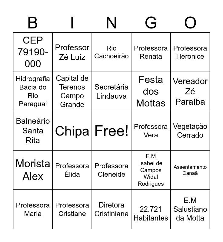 This bingo card has a free space and 24 words: Professora Élida, Professora Cristiane, Secretária Lindauva, Professora Maria, Professora Heronice, CEP 79190-000, Hidrografia Bacia do Rio Paraguai, Professor Zé Luiz, Professora Vera, Professora Cleneide, Festa dos Mottas, Balneário Santa Rita, E.M Isabel de Campos Widal Rodrigues, Assentamento Canaã, Capital de Terenos Campo Grande, 22.721 Habitantes, Vegetação Cerrado, Rio Cachoeirão, Vereador Zé Paraíba, Chipa, E.M Salustiano da Motta, Morista Alex, Professora Renata and Diretora Cristiniana.