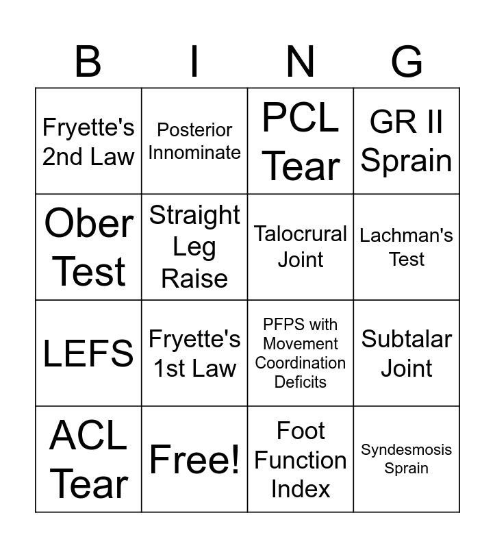 This bingo card has 24 words: Cluster of Laslett, C7 myotome, Lachman's Test, Spondylolysis, Ober Test, Fryette's 2nd Law, Straight Leg Raise, Posterior Innominate, Free!, Compression Pattern, LEFS, PFPS with Movement Coordination Deficits, Apley's Test, Cervical Myelopathy, Talocrural Joint, Mod. Thomas Test, Foot Function Index, PCL Tear, Fryette's 1st Law, Subtalar Joint, ACL Tear, Syndesmosis Sprain, GR II Sprain and GR III Sprain.