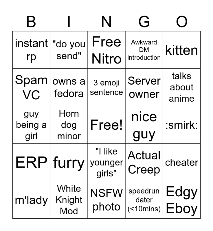 This bingo card has a free space and 24 words: m'lady, furry, 3 emoji sentence, speedrun dater (<10mins), kitten, instant rp, "do you send", Free Nitro, nice guy, :smirk:, guy being a girl, owns a fedora, Actual Creep, cheater, Spam VC, White Knight Mod, NSFW photo, Awkward DM introduction, talks about anime, ERP, Horn dog minor, "I like younger girls", Server owner and Edgy Eboy.
