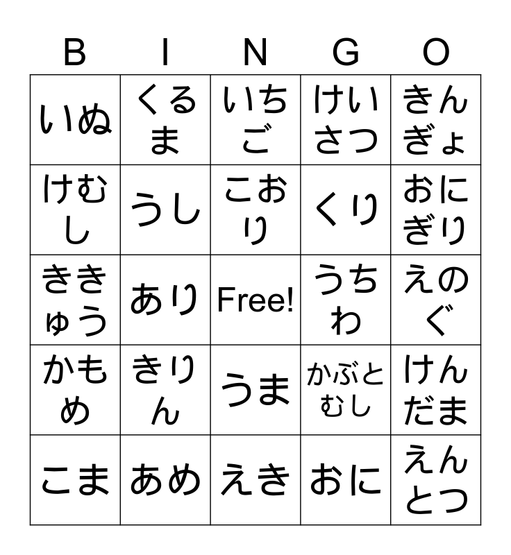 This bingo card has a free space and 30 words: あめ, あじさい, あり, いし, いぬ, いちご, うし, うま, うちわ, えき, えのぐ, えんとつ, おに, おばけ, おにぎり, かさ, かぶとむし, かもめ, きりん, きんぎょ, ききゅう, くじら, くるま, くり, けむし, けいさつ, けんだま, こま, こおり and こあら.
