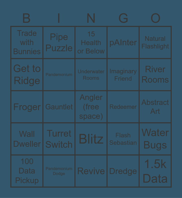 This bingo card has a free space and 41 words: Pinkie, Froger, Chainsmoker, Pandemonium, Pandemonium Dodge, Blitz, Underwater Rooms, Heavy Containment, Natural Flashlight, Wall Dweller, Gauntlet, pAInter, 1.5k Data, Abstract Art, Redeemer, Turret Switch, Oxygen Gardens, Trade with Bunnies, Room with Document, 15 Health or Below, Water Bugs, Hurt By Squiddle, Revive, Imaginary Friend, Candlebearer Room, Candlebrute Room, Dredge, Trench Rooms, River Rooms, Lava Room, Pipe Room, Pipe Puzzle, 100 Data Pickup, Play Game with Random(s), Flash Sebastian, Get to Ridge, Codebreaker Room, Fall to Your Death, Explode, Beat Searchlights and Buy Outfit.