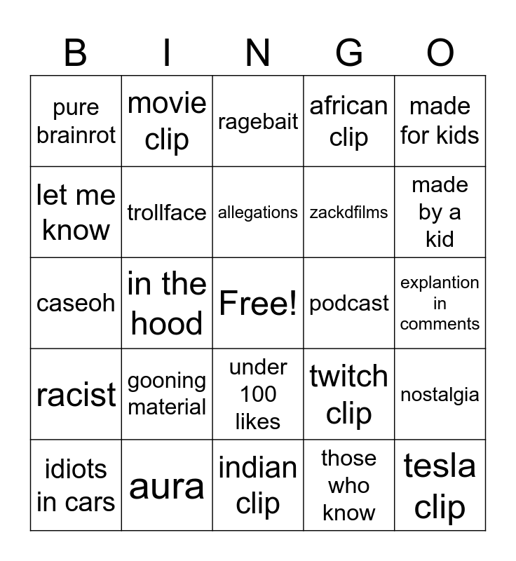 This bingo card has a free space and 24 words: gooning material, aura, allegations, idiots in cars, made for kids, pure brainrot, let me know, movie clip, podcast, under 100 likes, zackdfilms, caseoh, twitch clip, nostalgia, trollface, those who know, explantion in comments, ragebait, made by a kid, in the hood, tesla clip, racist, african clip and indian clip.