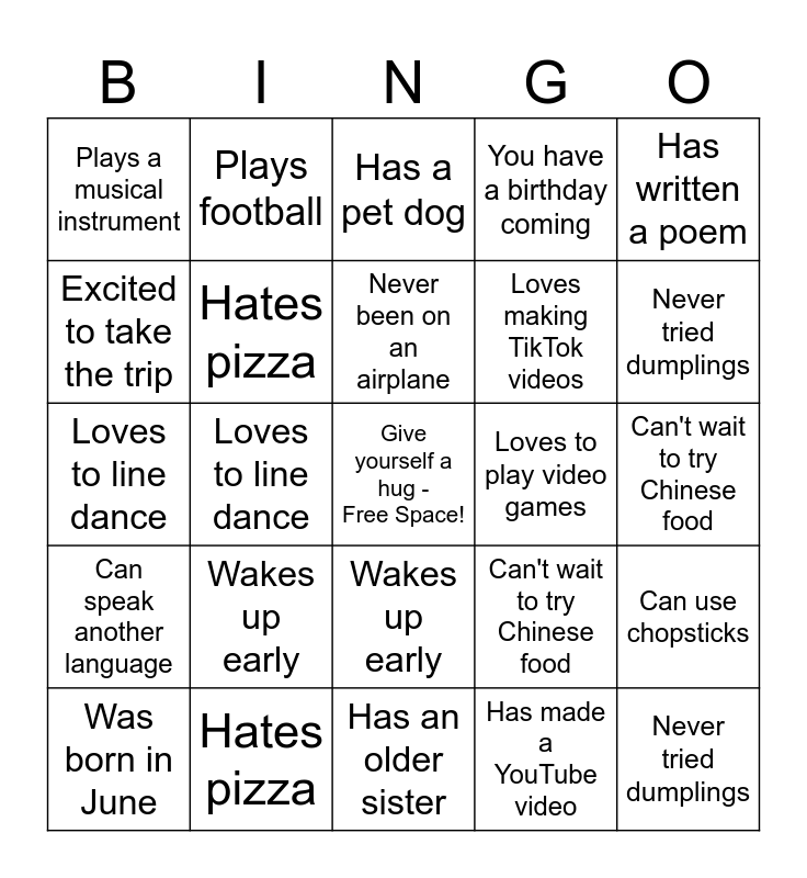 ⚠ This card has duplicate items: Is left handed (2), Never tried dumplings (2), Was born in June (2), Has an older sister (2), Wakes up early (2), Can speak another language (2), Plays football (2), Loves Reading (2), Excited to take the trip (2), Loves macaroni & cheese (2), Hates pizza (2), You have a birthday coming (2), Can use chopsticks (2), Can't wait to try Chinese food (2), Is an only child (2), Has gone on an international trip (2), Never been on an airplane (2), Loves to play video games (2), Has a pet dog (2), Has written a poem (2), Loves to line dance (2), Has made a YouTube video (2), Plays a musical instrument (2), Loves making TikTok videos (2)