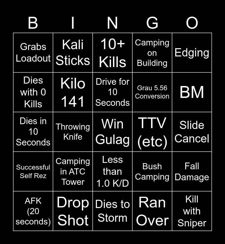 This bingo card has a free space and 28 words: Fall Damage, Killed by Sniper, Grau 5.56 Conversion, Ran Over, Dies with 0 Kills, 10+ Kills, Kali Sticks, Successful Self Rez, TTV (etc), AFK (20 seconds), Dies in 10 Seconds, Camping on Building, Drop Shot, Dies to Storm, BM, Under Level 55 (non-prestige), Camping in ATC Tower, Kilo 141, Drive for 10 Seconds, Less than 1.0 K/D, Grabs Loadout, Forgot to put on Armour, Kill with Sniper, Throwing Knife, Slide Cancel, Bush Camping, Edging and Cheating.