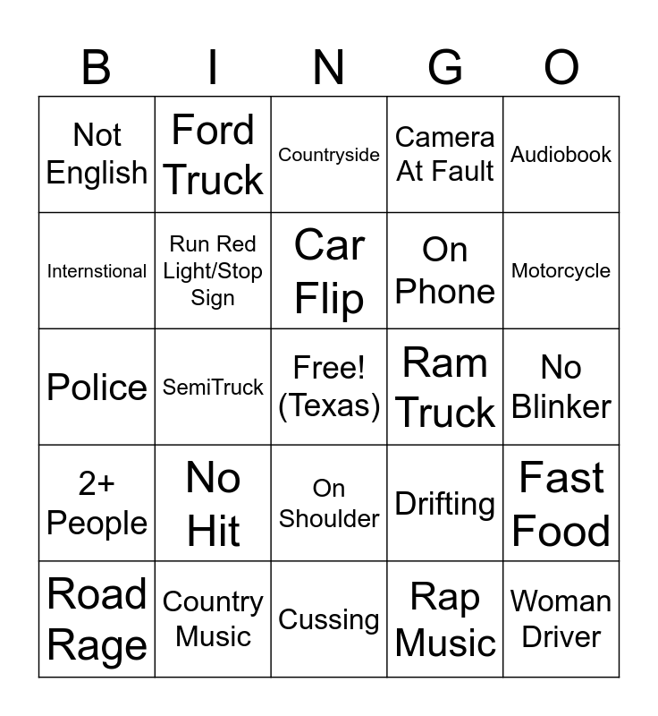 This bingo card has a free space and 24 words: No Hit, Country Music, Car Flip, Road Rage, Audiobook, Not English, Internstional, Ford Truck, Ram Truck, On Shoulder, On Phone, Police, Drifting, Fast Food, Run Red Light/Stop Sign, Rap Music, No Blinker, Countryside, Motorcycle, SemiTruck, Woman Driver, 2+ People, Camera At Fault and Cussing.