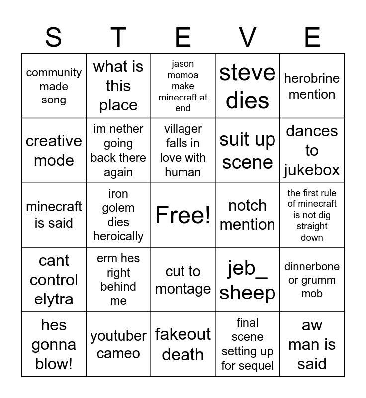 This bingo card has a free space and 24 words: erm hes right behind me, youtuber cameo, villager falls in love with human, hes gonna blow!, herobrine mention, community made song, creative mode, what is this place, notch mention, cut to montage, suit up scene, minecraft is said, jeb_ sheep, dinnerbone or grumm mob, im nether going back there again, final scene setting up for sequel, the first rule of minecraft is not dig straight down, jason momoa make minecraft at end, dances to jukebox, iron golem dies heroically, aw man is said, cant control elytra, steve dies and fakeout death.