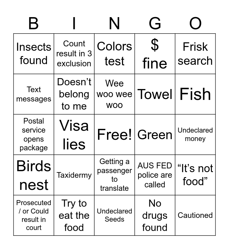 This bingo card has a free space and 34 words: Blame family member, No drugs found, Drugs found, Undeclared Cigarette, Birds nest, Doesn’t belong to me, Frisk search, Prosecuted / or Could result in court, Count result in 3 exclusion, I didn’t fill out the card, Wee woo wee woo, Colors test, Pink, Blue, Green, Fish, Try to eat the food, Postal service opens package, Taxidermy, AUS FED police are called, Getting a passenger to translate, Dog, Insects found, Undeclared money, Undeclared Seeds, Cautioned, $ fine, Cries, Towel, Text messages, Canceled visa, Visa lies, “It’s not food” and Has criminal history.
